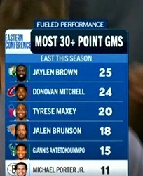 本赛季东部30+次数:杰伦·布朗25次领跑 米切尔、马克西分列二三